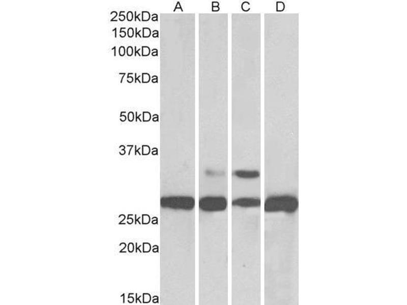 Western Blot: Approx 28 kDa band observed in Human, Mouse, Rat and Pig Liver lysates (calculated MW of 28.8 kDa according to NP_002620.1, NP_000281.2 and of NP_001025062.1). The additional 30 kDa band observed in the rodent lysates likely represent the acet