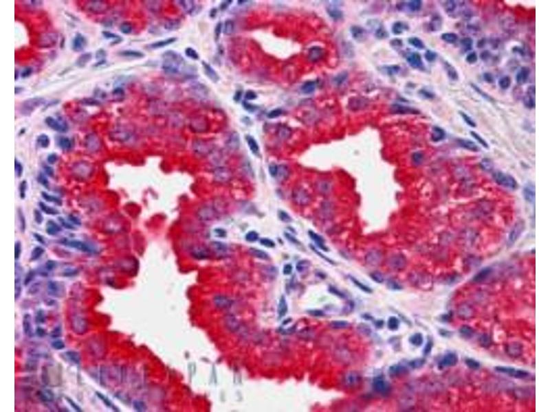 Immunohistochemistry: Paraffin embedded Human Prostate. Recommended concentration: 8 μg/mL.