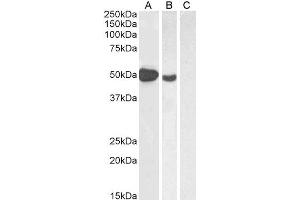 Western Blot: Approx 48-50 kDa band observed in Human Muscle lysates and in lysates of cell line MOLT4 (calculated MW of 47.2 kDa according to NP_054728.2). Recommended concentration: 1-3 μg/mL. Primary incubation 1 hour at room temperature. Negat