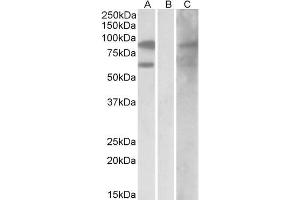 Western Blot: Approx 75 kDa band observed in lysates of cell line Jurkat, and in nuclear lysates of cell lines A431 and Jurkat (calculated MW of 71.0 kDa according to NP_037409.2). Recommended concentration: 0.3-1 μg/mL. Primary incubation 1 hour at room te