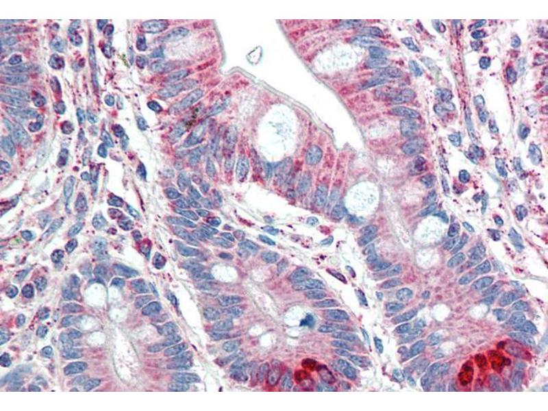 Immunohistochemistry: Paraffin embedded Human Liver and Small Intestine. Recommended concentration: 5 μg/mL.
