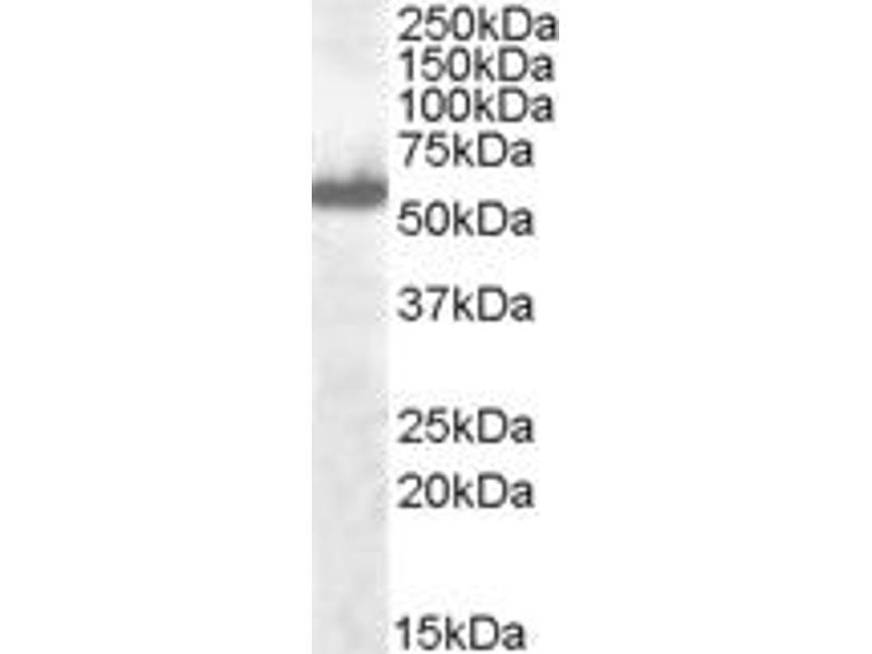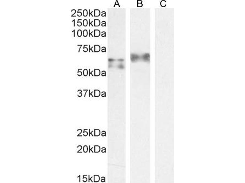 Western Blot: Approx 55+60 kDa bands observed in Human Spleen lysates and approx 65 kDa in lysates of cell line A549 (calculated MW of 57.8 kDa according to NP_001092099.1 and 56.0 kDa according to NP_116032.1, NP_001092097.2). Recommended concentration: 0.3