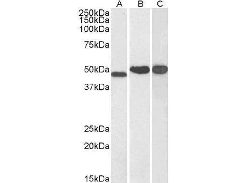 Western Blot: Approx 48 kDa band observed in Human Kidney, and approx 50 kDa band observed in Human Brain (Cerebellum) and Testis lysates (calculated MW of 42.8 kDa according to NP_006087.2). This molecular weight is routinely observed by other sources. Rec