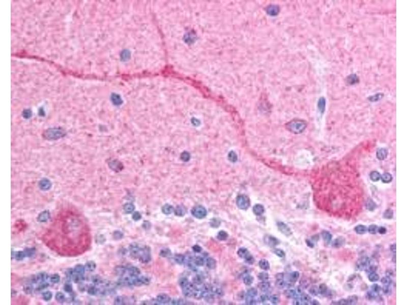 Immunohistochemistry: In paraffin embedded Human Brain (Cerebellum) shows stained Purkinje cells. Recommended concentration: 2.5 μg/mL.