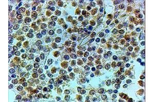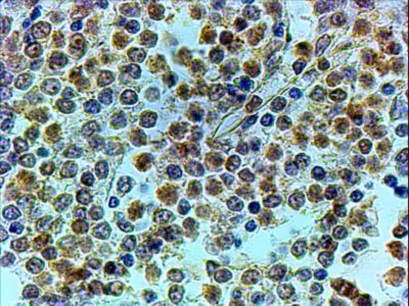 Immunohistochemistry: In paraffin embedded Human Spleen shows perinuclear and textured cytoplasmic staining in selective cells. Recommended concentration, 4-6 μg/mL.