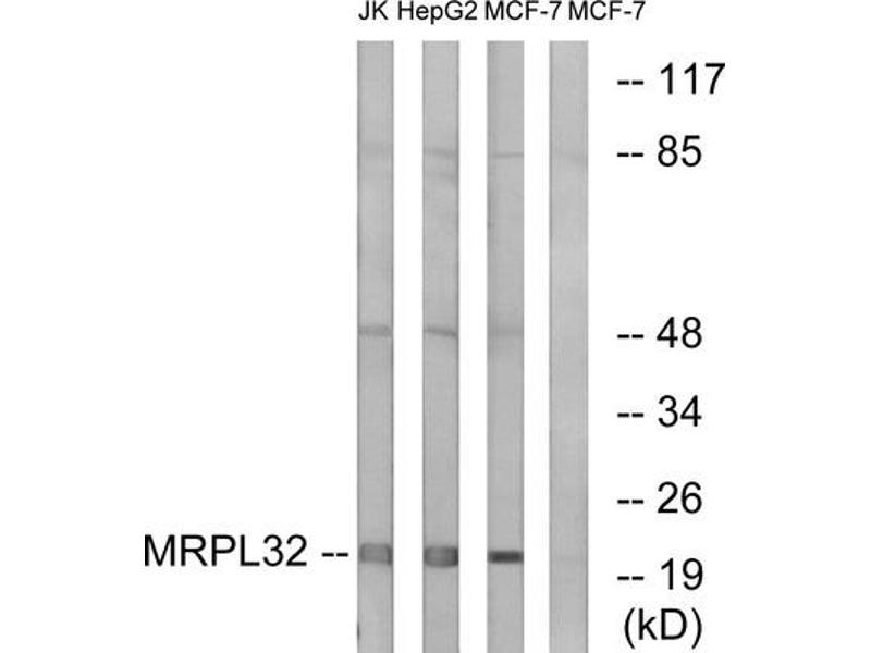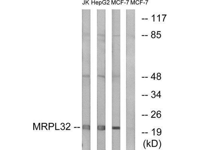 - The antiserum was produced against synthesized peptide derived from internal of human MRPL32.