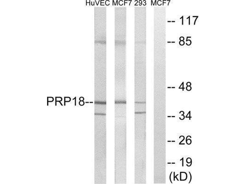 - The antiserum was produced against synthesized peptide derived from internal of human PRPF18.