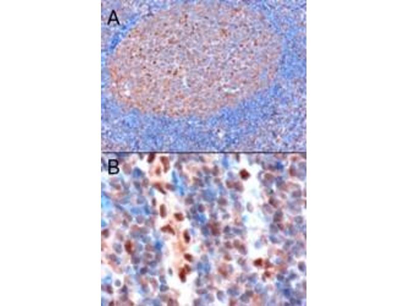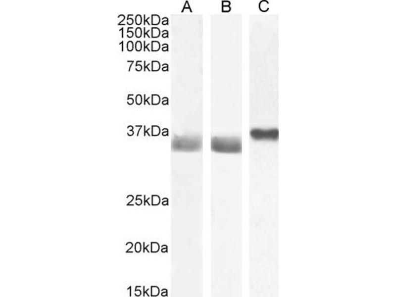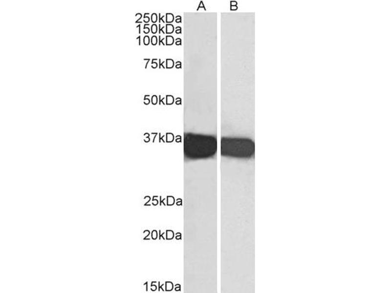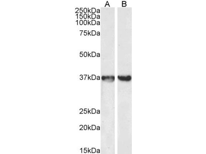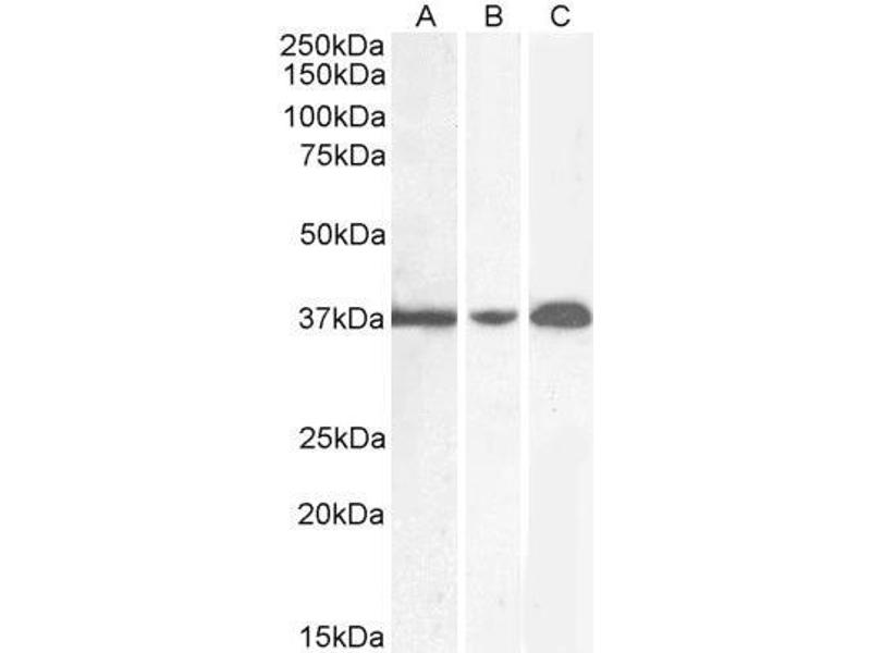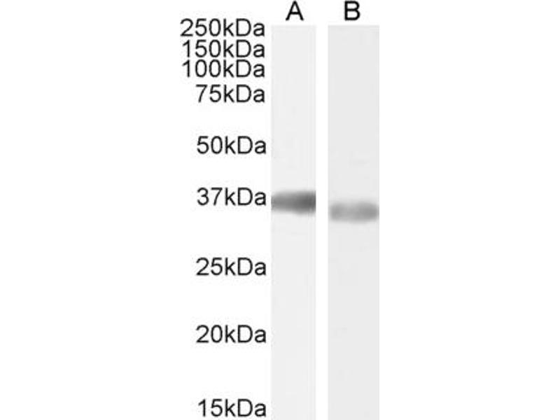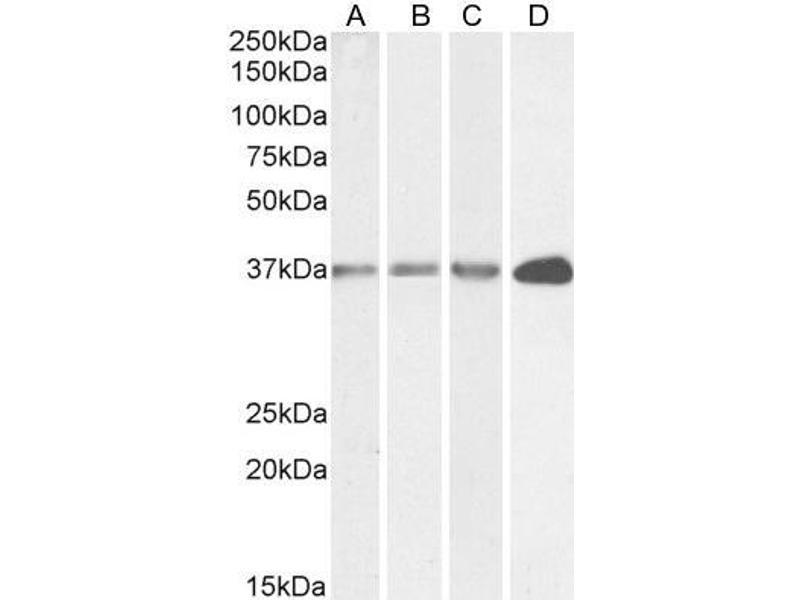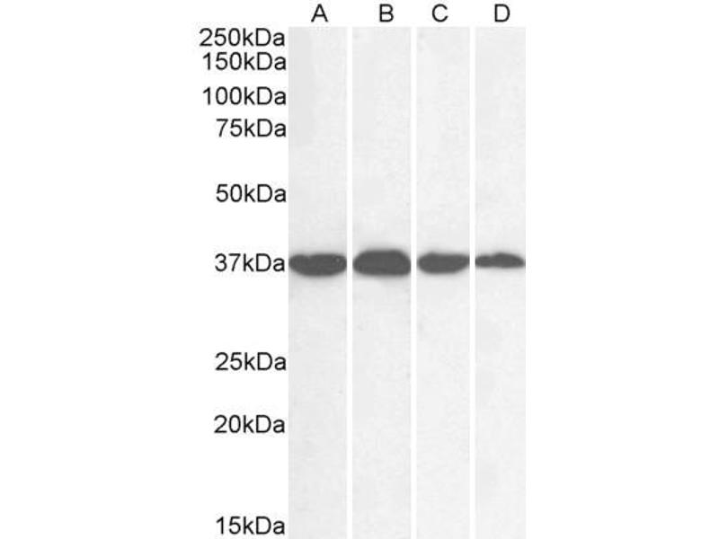 Western Blot: Approx 36 kDa band observed in lysates of cell line HEK293, approx. 37 kDa in Rat Brain lysates and approx.35 kDa in Human Liver and Tonsil lysates, lysates of cell line HeLa and in preliminary testing of Mouse Spleen lysates (calculated MW of