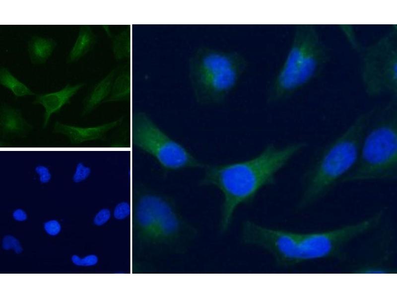 Immunofluorescence: Strong expression of the protein seen in the cytoplasm and vesicles of A549 and HeLa cells. Recommended concentration: 10μg/ml.