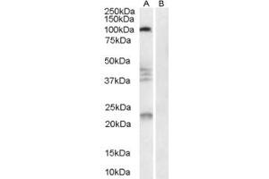 Western Blot: Experiments gave bands at approx 90-100 kDa and 37+40+45 kDa in Human brain lysate after 0.3 μg/mL antibody staining. These bands were successfully blocked by the immunizing peptide and they correspond to earlier findings in the literature wit
