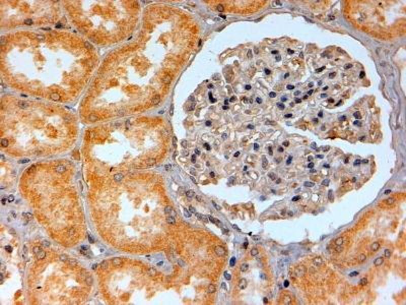 Immunohistochemistry: In paraffin embedded Human Kidney shows cytoplasm staining in cells of renal tubules. Recommended concentration: 2-4 μg/mL.