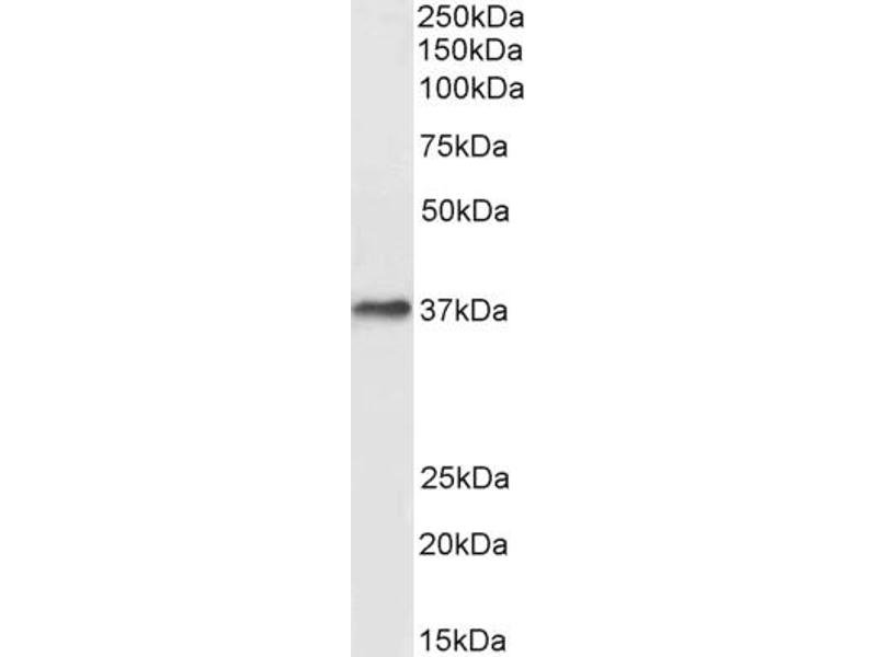 Western Blot: Approx 37 kDa band observed in Human Liver lysates (calculated MW of 35.6 kDa according to NP_002027.2). Recommended concentration: 0.3-1 μg/mL. Primary incubation was 1 hour.