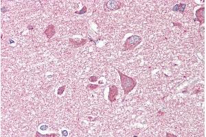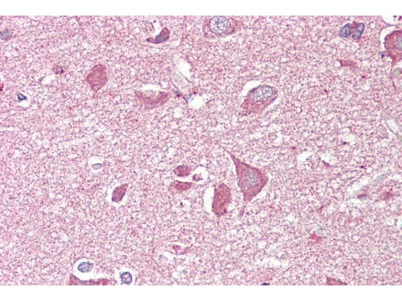 Immunohistochemistry: Frozen section of Olfactory bulb from transcardially PFA-perfused Mouse shows strong staining of axon bundles (right side middle, figure 1) and moderate peripheral staining outside the glomeruli (top, figure 1). NCAM2 (red) is sta