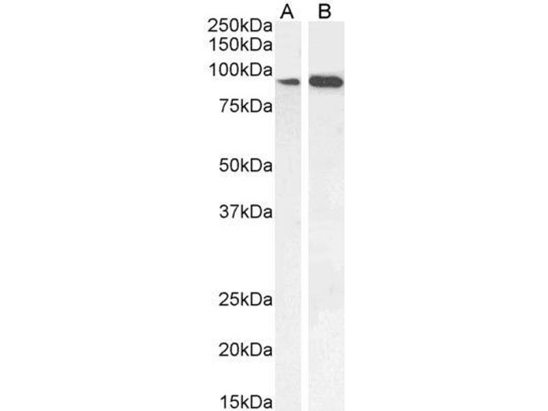 Western Blot: Approx 90 kDa band observed in lysates of cell line A549 and in Mouse Testis lysates, and in preliminary testing of Rat Testes lysate (calculated MW of 90.4 kDa according to Hunab NP_001340498.1, and 93.1 kDa according to Mouse NP_033402.2 93.