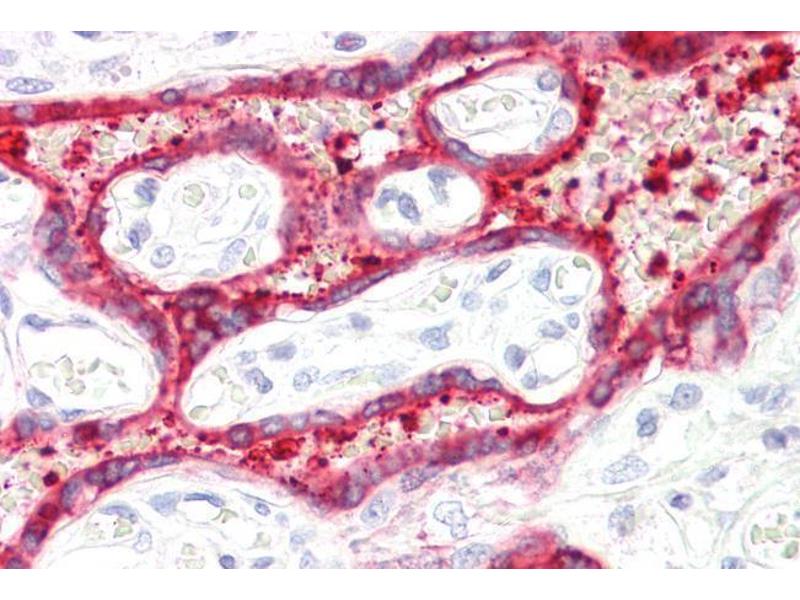 Immunohistochemistry: Paraffin embedded Human Placenta. Recommended concentration: 3.75 μg/mL.