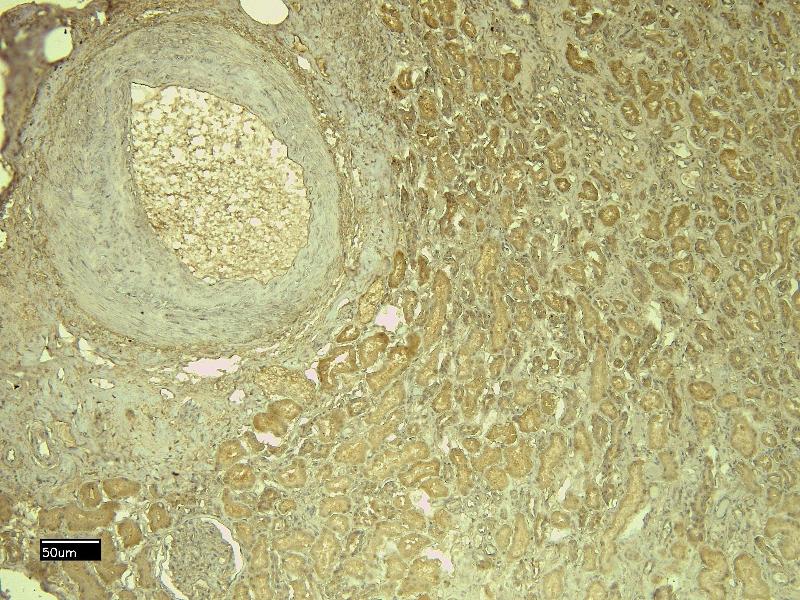 Immunohistochemistry: Paraffin embedded Human Kidney. Recommended concentration: 4-6 μg/mL.