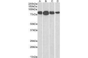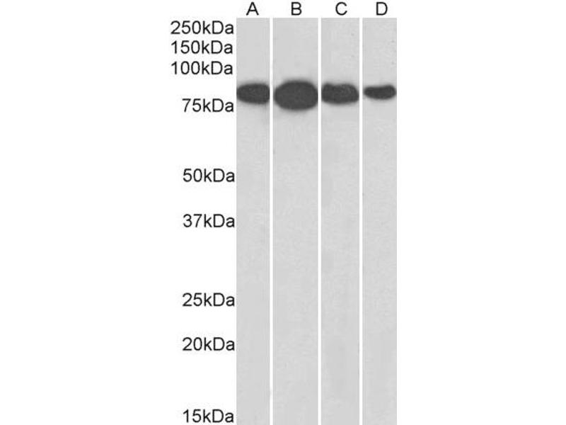 Western Blot: Approx 80 kDa band observed in Human Lymph Node, Tonsil and Spleen lysates (calculated MW of 68.6 kDa according to NP_002897.1). The same 80 kDa was also observed in lysates of several Mouse and Rat tissues and in lysates of cell lines NIH3T3