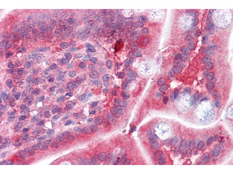 Immunohistochemistry: In paraffin embedded Human Brain (Cerebellum) shows staining of processes coming from the edge of the granular zone into the molecular layer. Recommended concentration: 2-4 μg/mL. Paraffin embedded Human Testis and Small Intestine. R