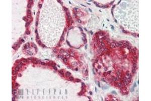 Immunohistochemistry: In paraffin embedded Human Thyroid Gland shows staining of cytoplasm and cell membrane of epithelial cells surrounding the follicles. Recommended concentration, 2-3 μg/mL.