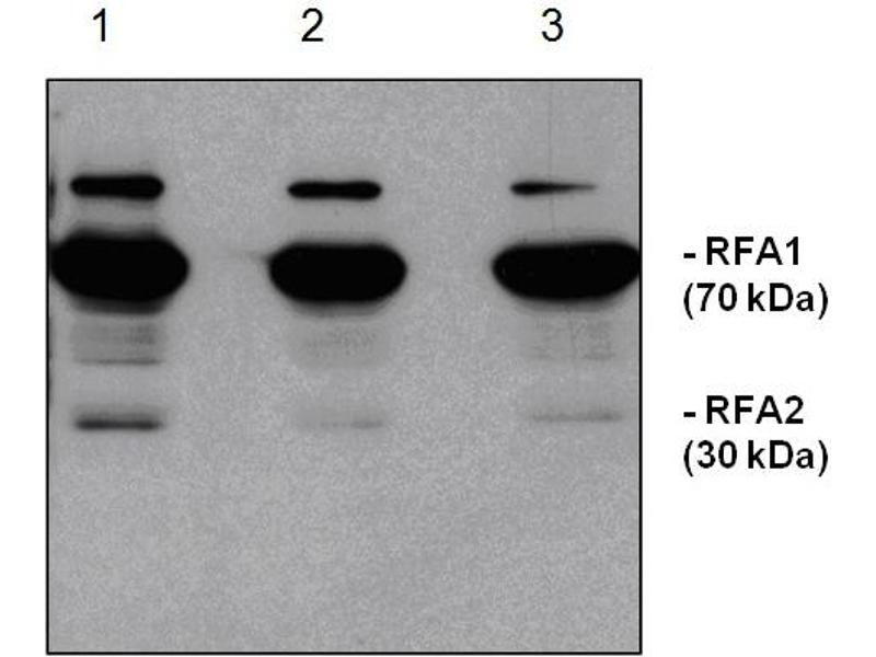 - Saccharomyces cerevisiaereplication protein A (RPA), also known as replication factor A (RFA) is a single-stranded DNA-binding protein that is required for multiple processes in eukaryotic DNA metabolism. Those processes include DNA replication, DNA repair, and recombination. Homologues to RPA have been identified in all eukaryotic organisms examined. RPA is heterotrimeric protein composed of subunits of approximately 70, 30, and 14 kDa. Members of this family bind nonspecifically to single-stranded DNA and interact with and/or modify the activities of multiple proteins. Alternative names: Replication protein A 69 kDa DNA-binding subunit, Single-stranded DNA-binding protein, DNA-binding protein BUF2, replication protein A 36 kDa subunit, DNA-binding protein BUF1 antibody
