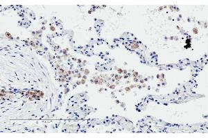 Immunohistochemistry: In paraffin embedded Human Lung shows staining of alveolar macrophages. Recommended concentration: 2-4 μg/mL.