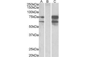 Western Blot: In transfected HEK293 transiently expressing full-length Human NRXN1 (myc and DYKDDDDK tagged), bands of approx. 75 and 60 kDa were observed. No bands were observed in mock-transfected HEK293 and the same band was observed using anti-DYKDDDD