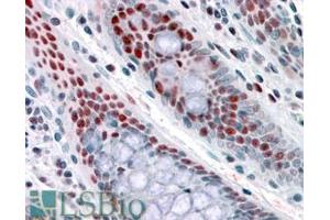 Immunohistochemistry: In paraffin embedded Human Colon shows nuclear staining in absorptive cells. Recommended concentration, 3-6 μg/mL.