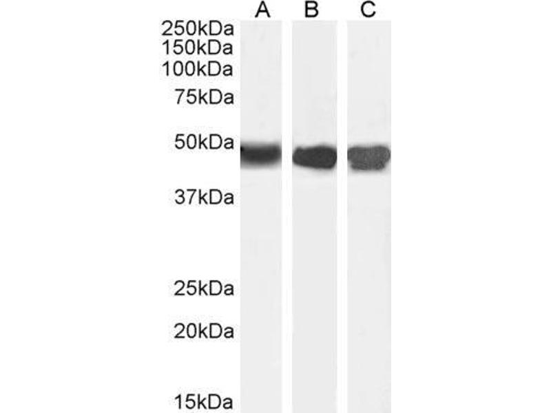 Western Blot: Approx 45 kDa band observed in lysates of cell lines A431 and NIH3T3 and approx.48 kDa in Human and Rat Kidney and in Mouse Liver lysates (calculated MW of 46.5 kDa according to Human NP_000041.2 and Rat NP_037289.1, and 46.6 kDa according to