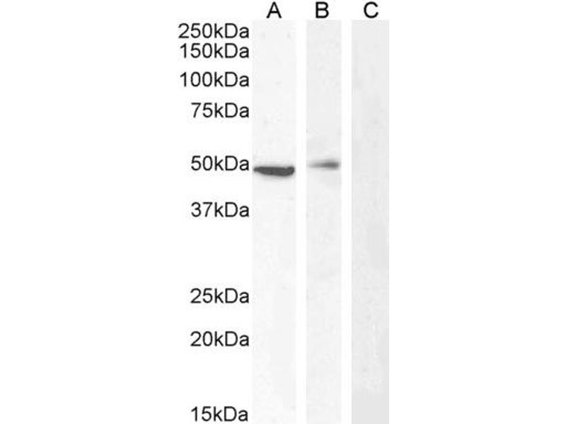 Western Blot: Approx 48-50 kDa band observed in lysates of cell line Jurkat and in Mouse Thymus lysates and approx 50 kDa in Peripheral Blood Mononuclear (PBM) and in Human Spleen lysates (calculated MW of 49.7Da according to Human NP_940919.1 and 49.9 kDa