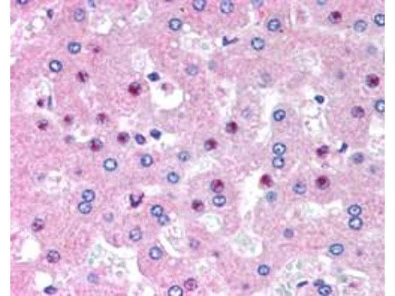 Immunohistochemistry: In paraffin embedded Human Liver shows staining of nucleoli in select hepatocytes. Recommended concentration, 2.5 μg/mL.