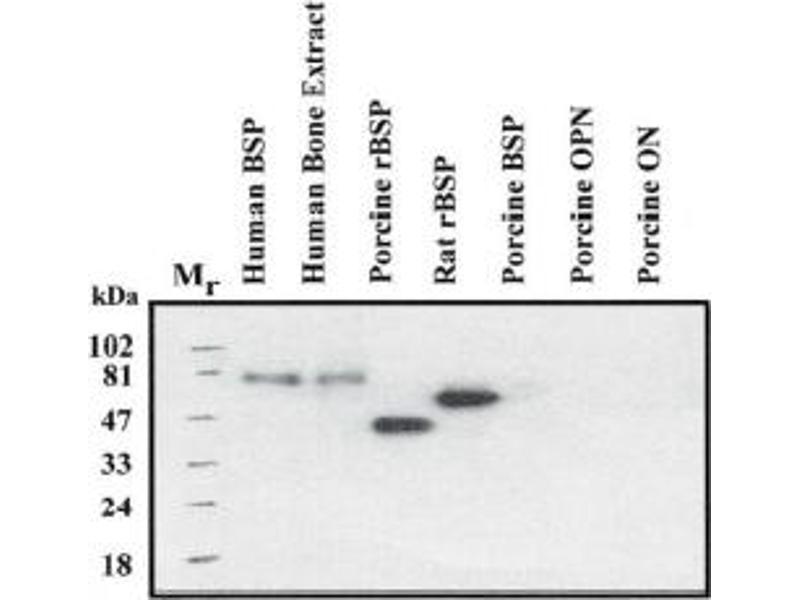 - This antibody recognizes Human Bone Sialoprotein, Recombinant Human, Recombinant Porcine and Recombinant Rat BSP. There was no cross reactivity obtained with Human, Porcine Osteonectin and Osteopontin.