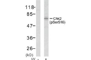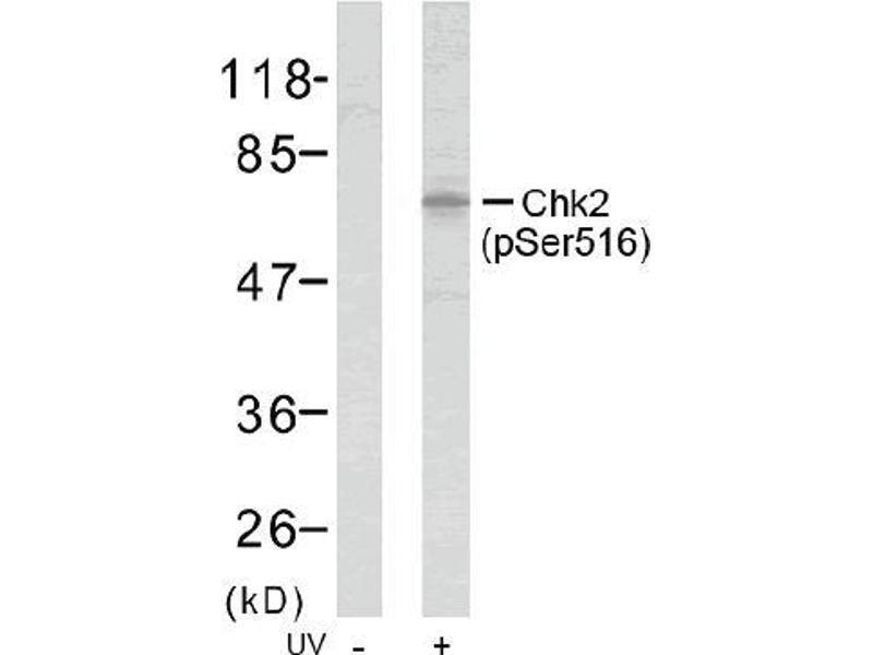 The antibody was affinity-purified from rabbit antiserum by affinity-chromatography using epitope-specific phosphopeptide. The antibody against non-phosphopeptide was removed by chromatogramphy using non-phosphopeptide corresponding to the phosphorylation site. Chk2 (phospho-Ser516) antibody detects endogenous levels of Chk2 only when phosphorylated at serine 516.