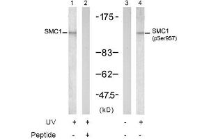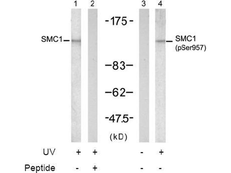 - The antibody was affinity-purified from rabbit antiserum by affinity-chromatography using epitope-specific phosphopeptide. The antibody against non-phosphopeptide was removed by chromatogramphy using non-phosphopeptide corresponding to the phosphorylation site. SMC1 (phospho-Ser957) antibody detects endogenous levels of SMC1 only when phosphorylated at serine 957.