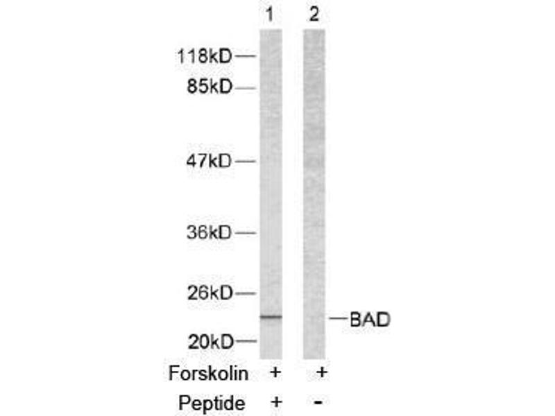 The antiserum was produced against synthesized non-phosphopeptide derived from human BAD around the phosphorylation site of serine 112 (H-S-SP-Y-P).