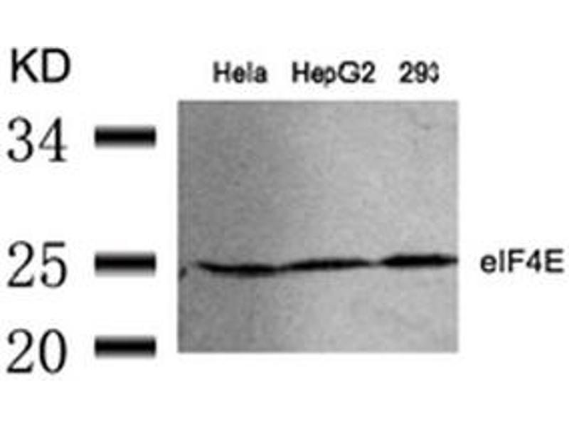 EIF4E, a protein modulates translation of maternal mRNAs in early embryos before the onset of zygotic transcription. eIF4E also influences the overall rate of translation. eIF4E binds to the 7 methyl GTP cap structure of eukaryotic mRNAs. Phosphorylation of eIF4E on serine 209 regulates the affinity of this protein for the 7 methyl GTP cap and/or RNA. Phosphorylation also enhances the interaction of eIF4E with eIF4G, which form a complex known as eIF4F. eIF4E phosphorylation is correlated with increased translational rate in a number of cell types. Several kinases are currently being investigated as potential regulators of eIF4E including PKC and/or the MAP kinase activated Mnk.Synonyms: EIF-4E, EIF4EL1, EIF4F, Eukaryotic translation initiation factor 4E, eIF-4F 25 kDa subunit, mRNA cap-binding protein