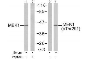 The antiserum was produced against synthesized non-phosphopeptide derived from human MEK1 around the phosphorylation site of threonine 291 (P-R-TP-P-G).