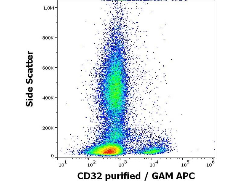 Fc fragment of IgG receptor IIa,CD32 (FcgammaRII) is a low affinity receptor for aggregated IgG. It is strongly expressed on monocytes, granulocytes, myeloid and myeloblastic cell lines, and weakly on B cells, CD34+ bone marrow cells, and resting and activated platelets. After binding its ligand, CD32 induces IgG-mediated phagocytosis and oxidative burst in monocytes and neutrophils, whereas in B cells it mediates a negative signal. This polymorphic transmembrane glycoprotein is expressed not only in the activating (CD32a) and inhibitory isoform (CD32b), but also in individual variants with differing avidities for IgG subtypes (e.g. the CD32a131R and CD32a131H allotypes).,FCG2, FCGR2A, IGFR2