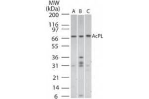 - A portion of amino acids 50-100 of human AcPL was used as the immunogen.