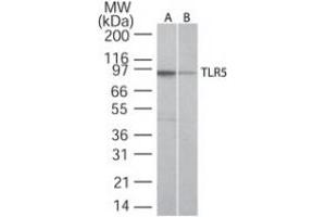 - KLH-conjugated synthetic peptide corresponding to a portion of human TLR5 between amino acids 700-800. The antibody also reacts with mouse TLR5.