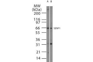 - A 66 kD band is observed. In human and mouse, SENP1 has different isoforms between 664 and 699 amino acids long. Additional bands seen in western blot may represent other SUMOlated proteins.