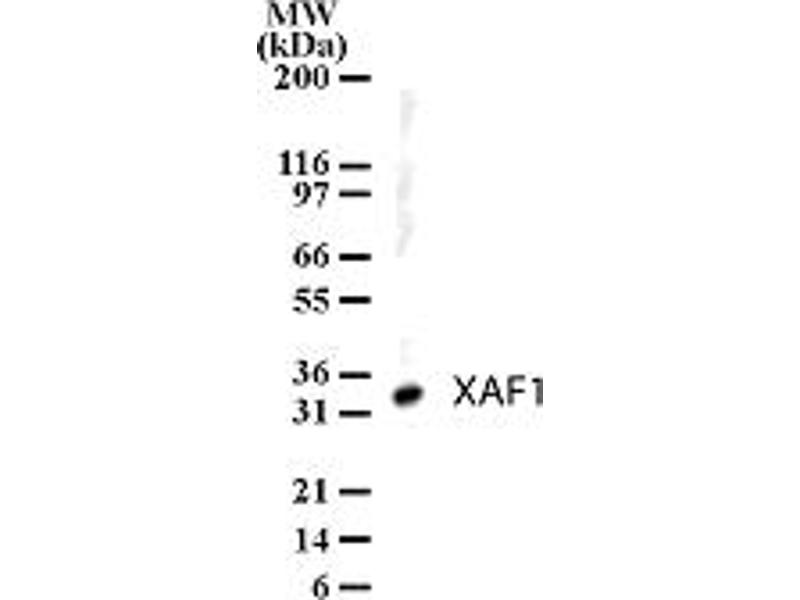 - Amino acids 201-218 (NQTSTMEKDVRPKTRSIN) and 301-317 (QLDLEKERYYKFKRFHF)of human XAF1, GenBank no. CAA68030.1, were used as immunogen. Percent identity by BLAST analysis: Human, Gorilla, Gibbon (100%), Monkey (89%).