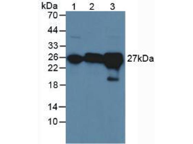 - Western blotting: 0.01-2 μg/mL,Immunohistochemistry: 5-20 μg/mL,Optimal working dilutions must be determined by end user.