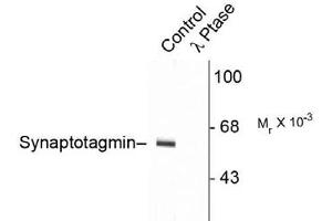 - Specific for the ~60k - 62k synaptotagmin protein phosphorylated at Thr202. The immunolabeling is completely eliminated by X-phosphatase treatment