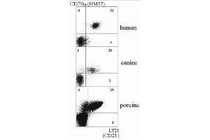 The antibody LT21 reacts with CD21 (CR2), a 145 kDa transmembrane glycoprotein (complement C3d receptor - C3dR) expressed on B lymphocytes, follicular dendritic cells, some epithelial cells and a subsets of T lymphocytes. It is not expressed on immature B cells.