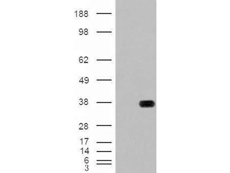 Western Blot: Approx. 33 kDa band observed in Human Heart, Muscle and Kidney lysates (calculated MW of 34.3 kDa according to NP_005318.2). In transfected HEK293 transiently expressing HADH a band of approx. 38 kDa is observed. This band is not observed in t