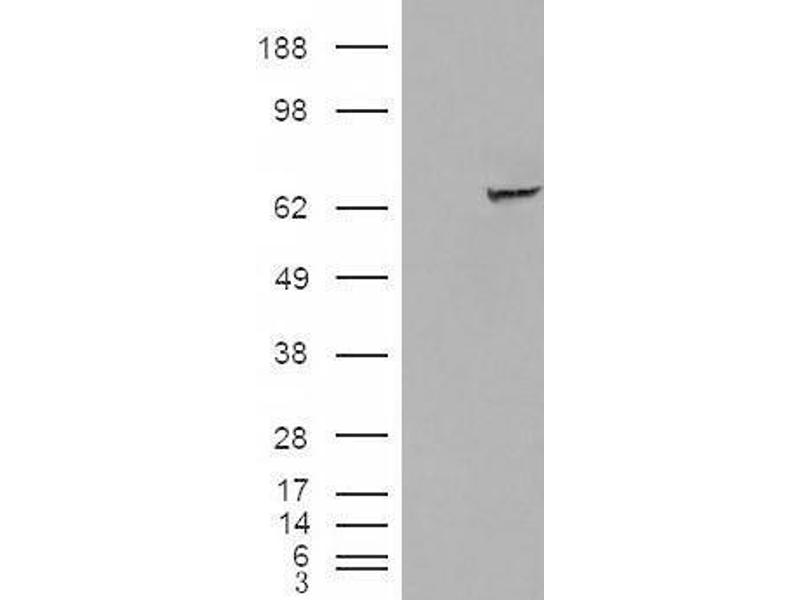 Western Blot: Approx. 60-70 kDa band observed in lysates of cell line HepG2 (calculated MW of 66.1 kDa according to NP_006539.3). In transfected HEK293 transiently expressing IGF2BP2 a band of approx. 65 kDa is observed. This band is not observed in the non