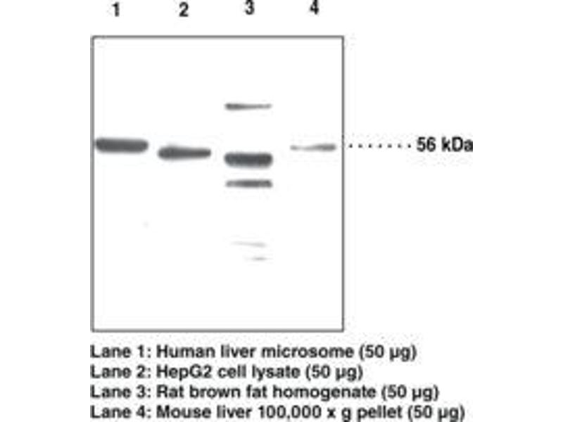 Detects the enzyme at 56 kDa by western blot from tissues and cells such as brown fat, liver, mouse macrophages, and Hep-G2 cells.