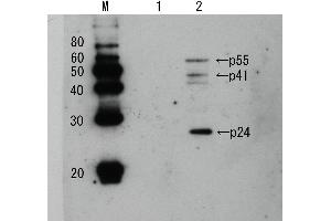 - HIV-1 Gag p24 is a capsid protein that constitutes the core of AIDS virus HIV-1 and is produced by digestion of its precursor Gag p55 by HIV-1 protease. This protein is indispensable to the reproduction of AIDS virus and constitutes an essential element for the AIDS virus particle construction. p24 is used as a marker antigen for observing the patient's condition after treatment, as it indicates the amount of virus in the blood. The product is prepared by immunizing rabbit with recombinant p24 protein which was over-expressed in E. coli with a plasmid carrying the Gag p24 coding region of HIV-1 virus, subtype B, and was highly purified by several steps of chromatography. Using this antiserum in Western blotting, the bands of 24 kD, 55 kD and 41 kD corresponding respectively to HIV-p24 and its precursors p55 and p41 were observed in the extract of the AIDS virus infected cells.