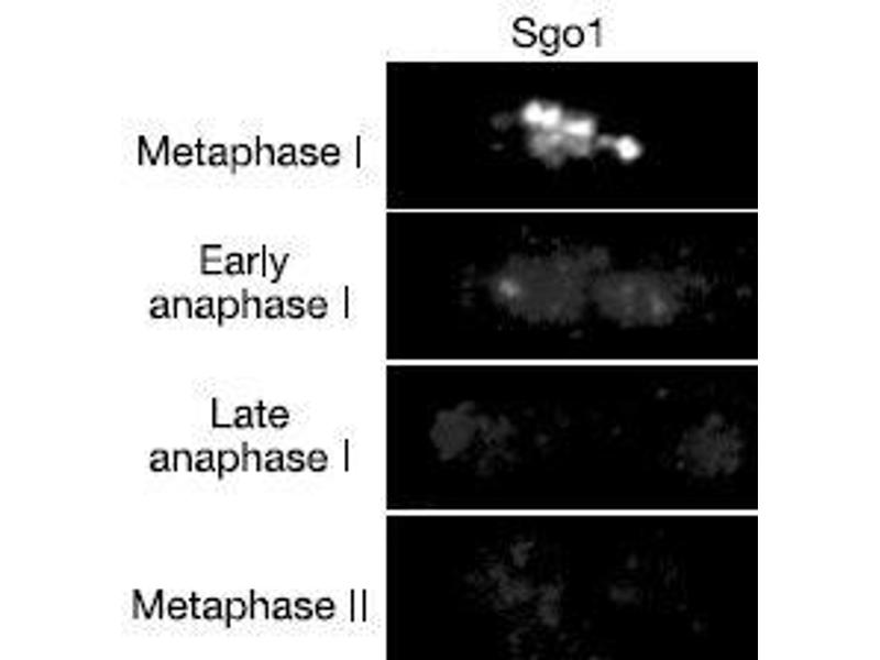 - Shugoshin 1 (Sgo1), a meiosis-specific protein, protects centromeric Rec8 from degradation during first meiotic division (meiosis I) in fission yeast Schizosaccharomyces pombe. This protein appears at late prophase of meiosis I and is degraded at anaphase I. Heterochromatin protein Swi6 associates directly with Sgo1. A point mutation of Sgo1 (V242E), which abolishes the interaction with Swi6, impairs the centromeric localization and function of Sgo1. The forced centromeric localization of Sgo1 restores proper meiotic chromosome segregation in swi6 cells. Using this antibody in Western blotting, the band of 37 kD was observed in wild type S. pombe MP111 extract.