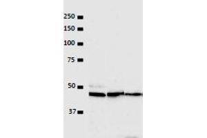 1. Western blotting: 1/200~1/1,000 dilution. Use of highly sensitive chemiluminescence reagents such as Lumi-Light Plus (Roche) or ImmunoStaroR LD (Wako,Tokyo) are recommended.